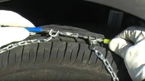 Una vez que tenemos las cadenas sacadas hacia afuera rodeando la rueda, amárralas con ganchos para que se quede tensa en toda la rueda.