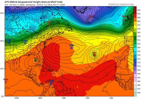*Temperatura y geopotencial a 500 hPa previsto por el modelo GFS / Tropical Tidbits / Giphy