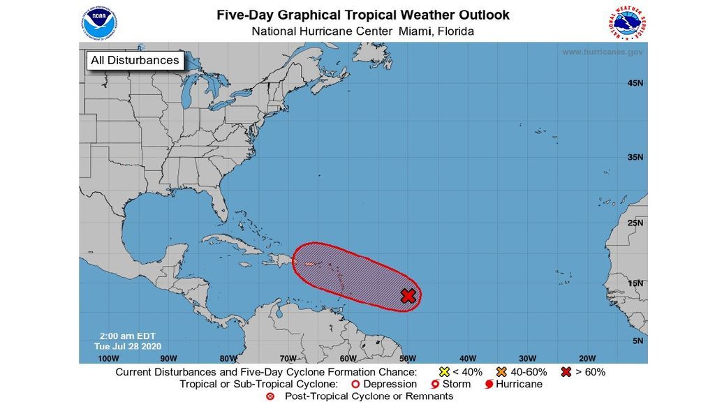 El segundo huracán podría no tardar en llegar. Esta vez, eso sí, el Centro Nacional de Huracanes (NHC, por sus siglas en inglés) no lo ve tan claro. Parece que Isaias podría quedarse en ciclón tropical sin adquirir la categoría 1. En caso contrario, si se observa una organización de sus vientos en su aproximación a las Islas de Barlovento del Caribe, se emitirá una alerta, entre otras, en Barbados, pudiendo llegar a Puerto Rico.