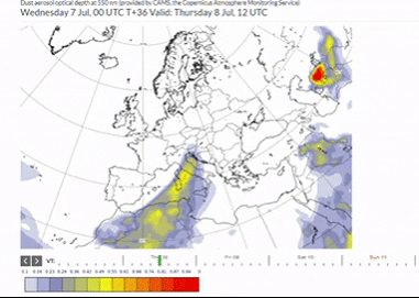 A continuación vemos cómo prevé que avance ese polvo sahariano el Servicio de Monitoreo de la Atmósfera de Copernicus (CAMS).