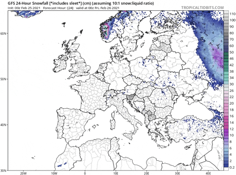 *Nieve 24 h prevista por el modelo GFS para los próximos días / Tropical Tidbits