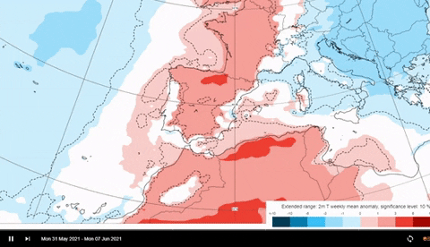 La previsión del Centro Europeo de Previsiones Meteorológicas a Plazo Medio (ECMWF) apuesta por el momento como el escenario más posible una tendencia a temperaturas más altas de lo habitual para junio por lo menos durante las primeras tres semanas. No está muy claro cómo se comportarán las precipitaciones, pero todo apunta a que podrían escasear las últimas semanas de la primavera.
