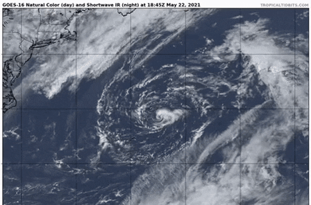 El viernes todos los ojos miraban al Atlántico en vista de que un sistema de bajas presiones empezaba a coger fuerza no muy lejos de Bermudas, referido entonces como ‘Invest 90 L’. La madrugada del sábado este sistema fue nombrado Ana al adquirir intensidad de ciclón subtropical y, para el domingo por la noche, se debilitaba a ‘postropical’. No ha afectado ni afectará a tierra.