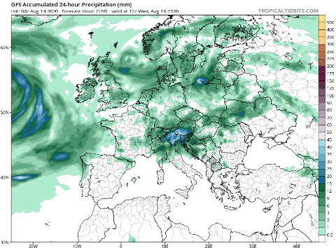 *Precipitación acumulada en 24 horas entre el miércoles y el viernes prevista por el modelo GFS / Tropical Tidbits