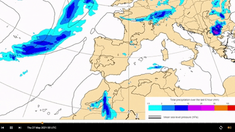 El viernes, aunque todavía podrán darse lluvias puntualmente intensas en el área del Mediterráneo, incluidas las Baleares, la atención pasará a centrarse en una vaguada -elongación de bajas presiones- que se descolgará de la circulación general al oeste de la Península Ibérica.