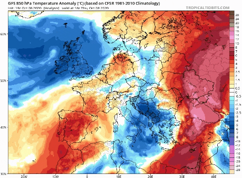 *Temperatura y geopotencial a 850 hPa previsto por el modelo GFS / Tropical Tidbits / Giphy