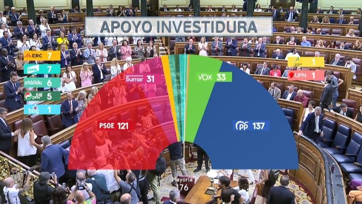 El candidato popular se quedará a 4 votos de alcanzar la presidencia del Gobierno, Alberto Núñez Feijóo contará con el apoyo de los 137 diputados del PP, los 33 de Vox, el diputado de Coalición Canaria y el de Unión del Pueblo Navarro. Enfrente se encontrará con los 121 diputados del PSOE, 31 de Sumar,7 de ERC, 7 de Junts, 6 de Bildu, 5 del PNV y el único diputado del BNG.