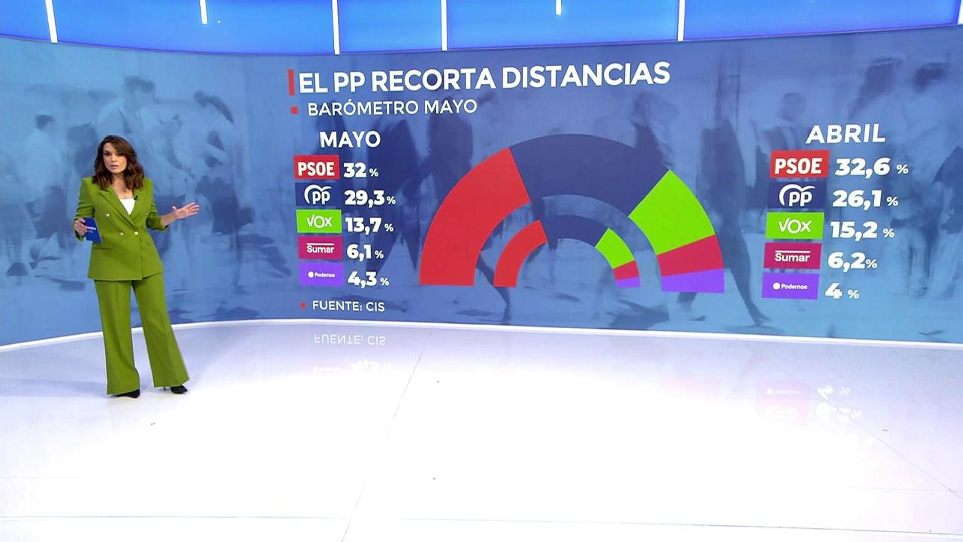 El PSOE sigue a la cabeza en intención de voto con el 32 % , pero el PP recorta la distancia que le separa de los socialistas a 2,7 puntos en el último barómetro del CIS, con encuestas realizadas justo después del gran apagón eléctrico y de las incidencias ferroviarias de comienzos de mayo.