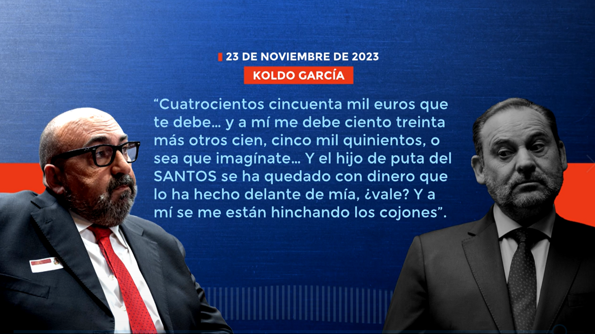 "450.000 euros que te debe. Y a mí me debe 130 más otros 100, 5.500...o sea que imagínate. Y el hijo de puta del Santos se ha quedado con dinero que lo ha hecho delante de mí, ¿vale? Y a mí se me están echando los cojones", se escucha decir a Koldo en el audio.