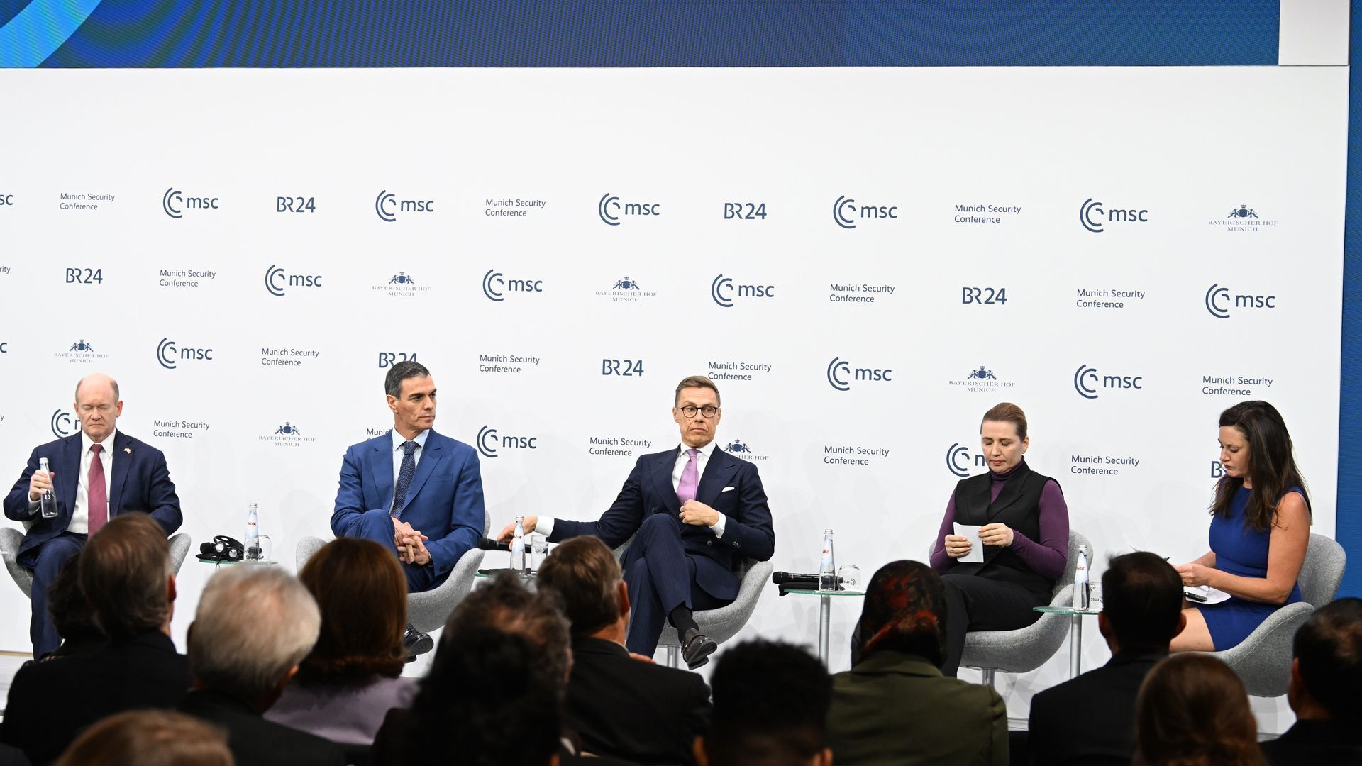 El presidente del Gobierno español, Pedro Sánchez, enun panel de la Conferencia de Seguridad de Múnich junto al presidente de Finlandia, Alexander Stubb; la primera ministra de Dinamarca, Mette Frederiksen; y el senador estadounidense Christopher A. Coons