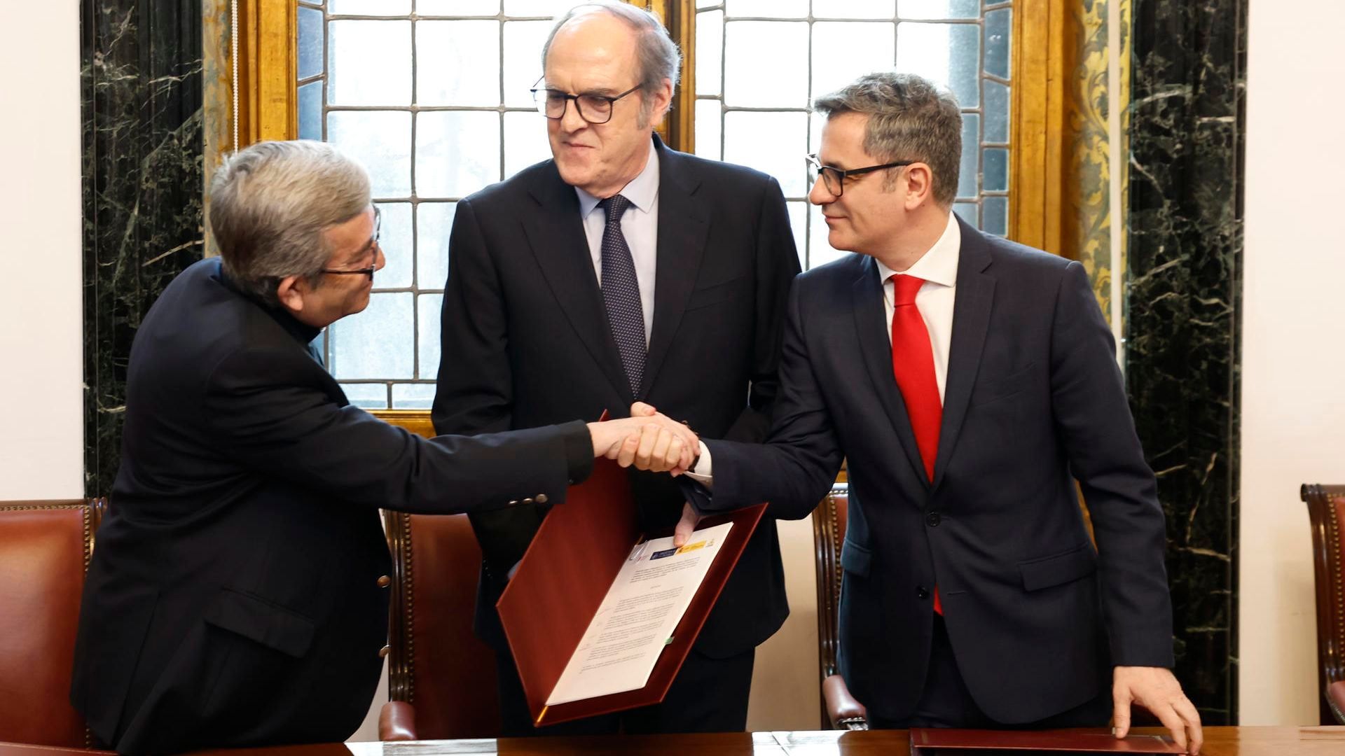 El acuerdo ha sido firmado por el ministro de la Presidencia, Félix Bolaños; el presidente de la Conferencia Episcopal Española (CEE), Luis Argüello; el presidente de la Conferencia Española de Religiosos, Jesús Díaz Sariego, y el Defensor del Pueblo, Ángel Gabilondo.
