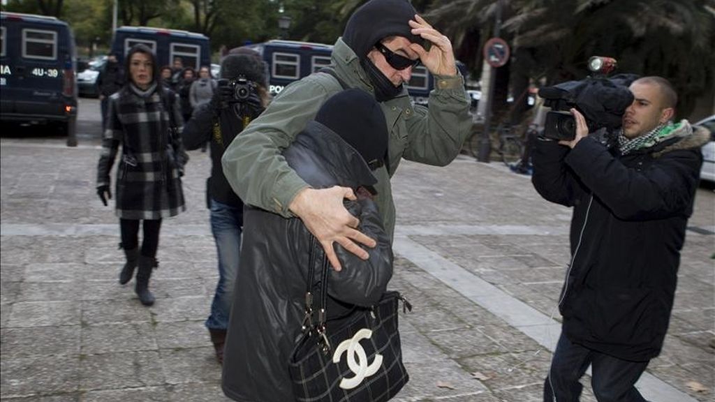 La madre de Javier G.M., apodado "El Cuco" (con la cara tapada y agazapada entre el brazo de un acompañante), llega al edificio de la Audiencia de Sevilla donde en el Juzgado de Menores número 3 comienza la vista oral, a puerta cerrada, contra su hijo el único menor de los cinco acusados por los hechos que desembocaron en el asesinato de la joven Marta del Castillo, de cuya desaparición se cumplen hoy dos años. EFE