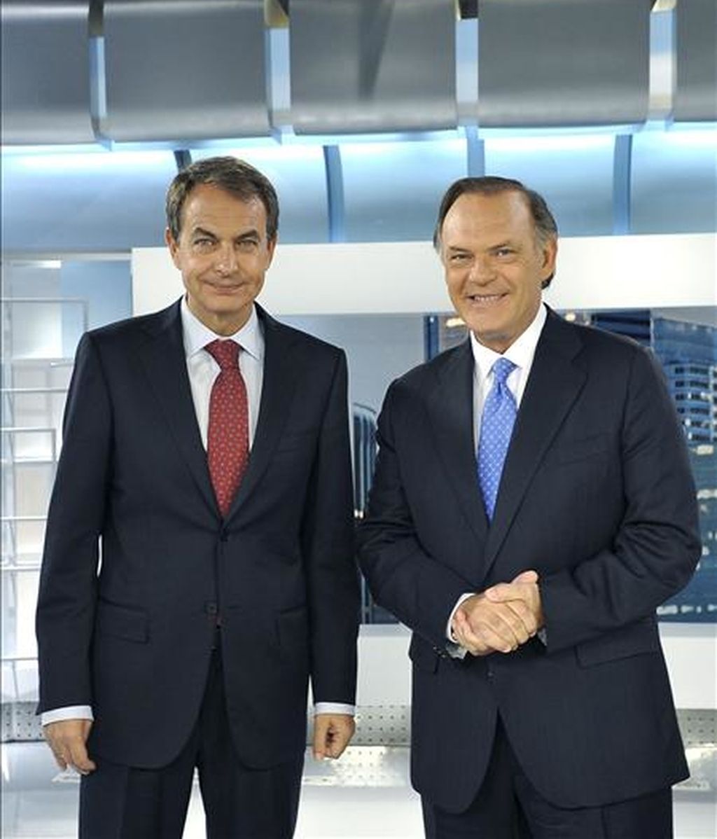 El Presidente del Gobierno, José Luis Rodríguez Zapatero (i), y el periodista Pedro Piqueras, momentos previos a la entrevista que el jefe del ejecutivo ha concedido esta noche a los informativos de la cadena Telecinco, en Madrid. EFE