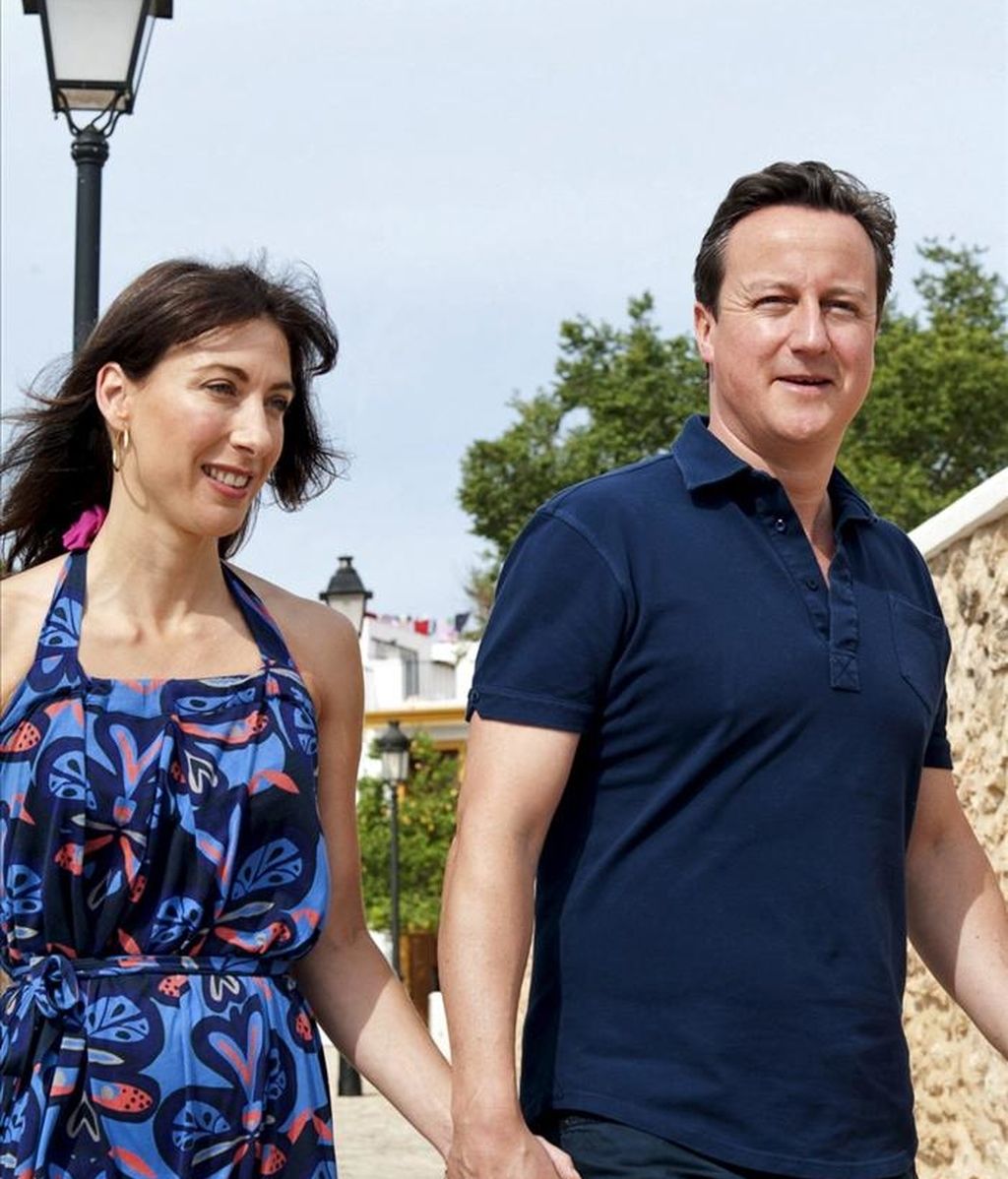 El primer ministro británico, David Cameron, que disfruta de una semana de vacaciones en Ibiza junto a toda su familia: su esposa Samantha y sus tres hijos Nancy, Arthur y Florence, durante el paseo que dio esta mañana con su mujer por las calles de Santa Gertrudis, un municipio del centro de Ibiza que es desde hace años destino favorito de numerosos turistas británicos y alemanes. EFE