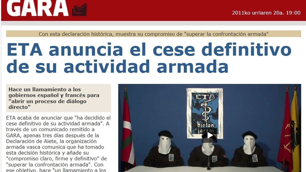 El diario estadounidense The New York Times ha asegurado que, junto a la cadena de televisión pública británica BBC, recibió con antelación el vídeo y el comunicado de ETA en el que la banda ha anunciado el fin de la actividad armada y tuvo que mantener el material embargado hasta este jueves a las 19.00 horas (18.00 horas en Londres).