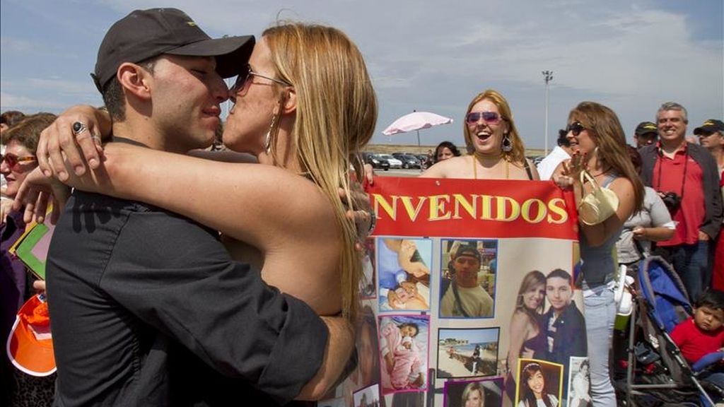 Familiares y amigos reciben a la tripulación de la fragata "Canarias", que ha regresado hoy a la Base Naval de Rota, en Cádiz, después de ejercer durante casi cinco meses como buque de mando de la Fuerza Naval Europea en la misión "Atalanta" de lucha contra la piratería en aguas de Somalia. EFE