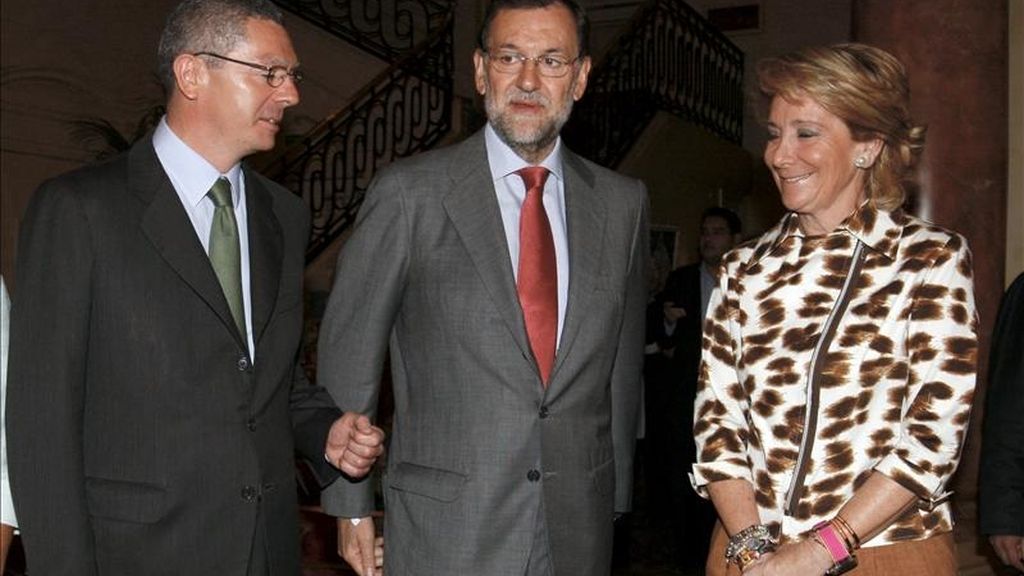 El alcalde de Madrid y candidato del PP a la reelección, Alberto Ruiz-Gallardón (i), junto al presidente del PP, Mariano Rajoy (c) y la presidenta de la Comunidad y también candidata a la reelección, Esperanza Aguirre (d), durante el desayuno informativo que Nueva Economía Fórum ha celebrado esta mañana en Madrid. EFE