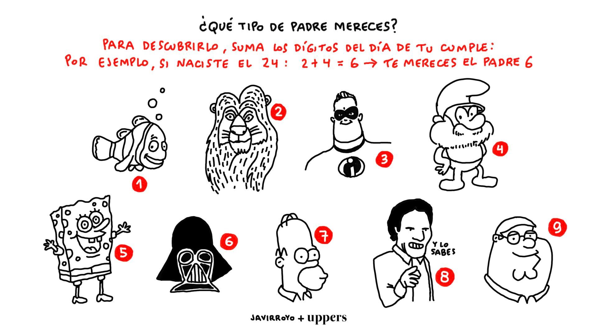 Seguro que este jueves pasado acabaste regalando unos calcetines a tu padre… ¡Con lo que te ha cuidado siempre y tú regalándole calcetines a última hora! Como castigo, hoy te traemos el juego de: EL PADRE QUE TE MERECES. Suma los dígitos del día de tu cumpleaños y el número resultante es el padre que te mereces (ejemplo: si has nacido el 24, suma 2+4=6 ; te mereces el padre número 6)