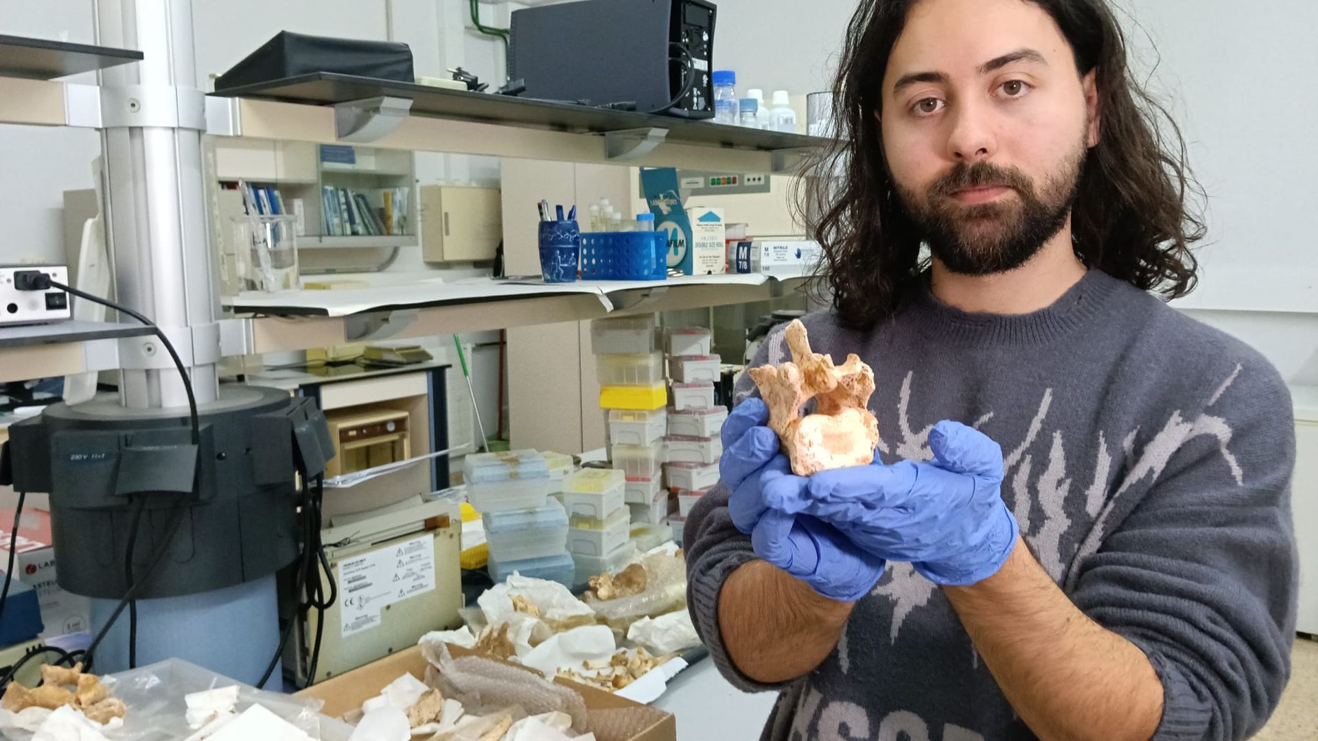 Alvar Manjón, biólogo-paleontólogo que ha participado en el descubrimiento, mostrando una vértebra del León Cavernario.. Redacción Euskadi