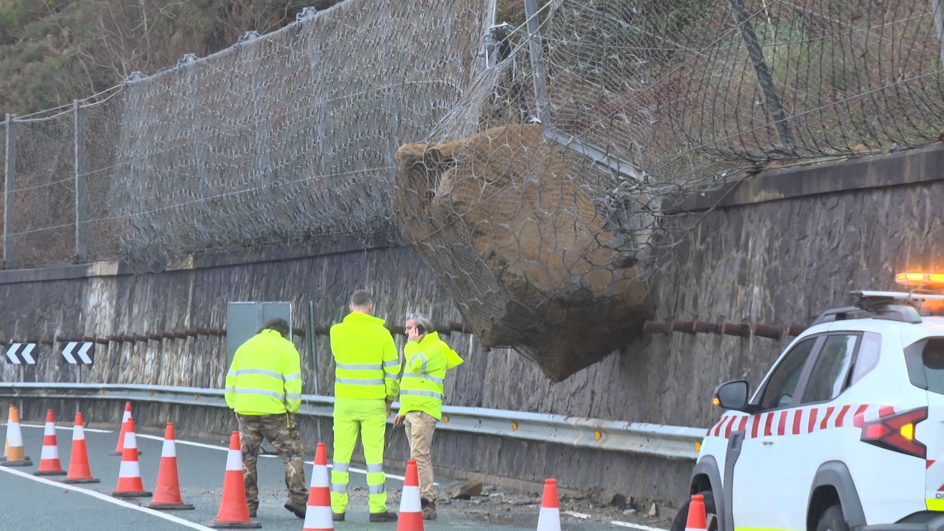 Viendo las dimensiones de la roca que ha quedado suspendida sobre la N-634 en Guipúzcoa no cuesta imaginar la magnitud que podría haber adquirido la tragedia si la enorme piedra llega a impactar contra el asfalto, en lugar de quedar colgando de la malla metálica.