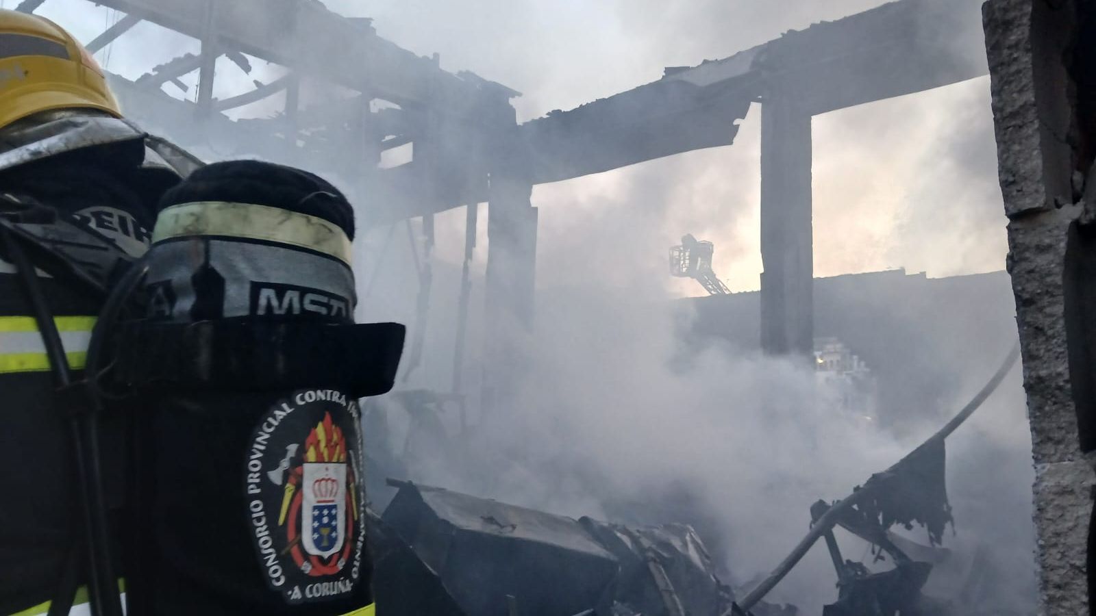 El incendio se declaró el martes pasadas las seis de la tarde por causas que todavía se desconocen. Y a pesar de estar controlado, permanece activo en la mañana del miércoles en una zona lateral de la nave, según ha confirmado el concello de Sada.