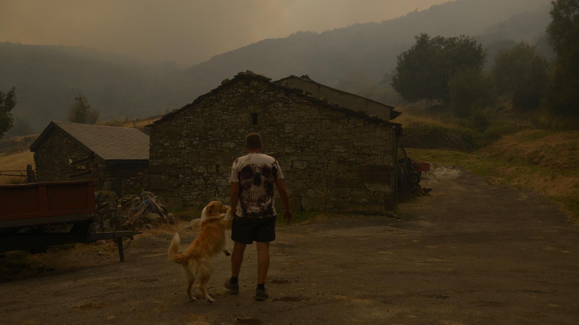 Una persona con su perro observa el incendio en Requeixo. Informativos Telecinco