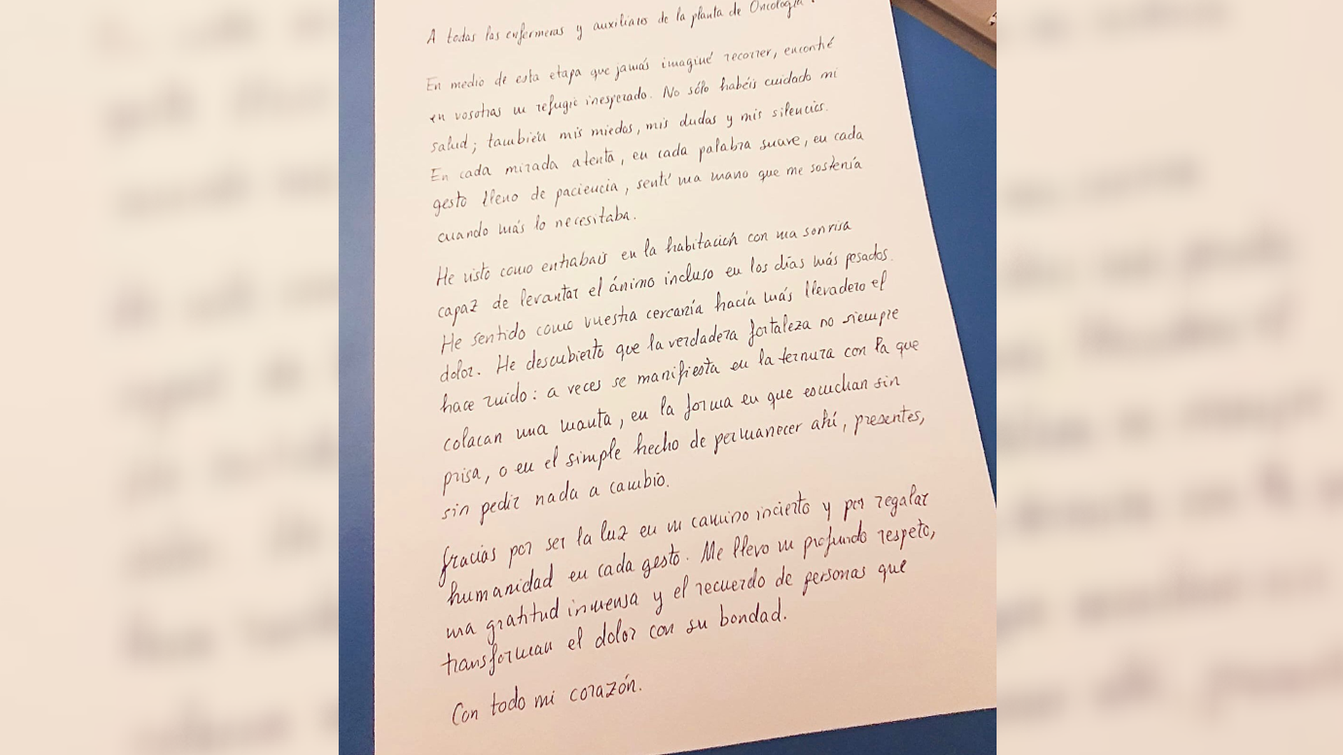 La paciente se fija en “cada mirada atenta, en cada palabra suave y en cada gesto lleno de paciencia”, en el que encontró “una mano que me sostenía cuando más lo necesitaba”. Tampoco esquiva hablar de los momentos más difíciles de su tratamiento oncológico.