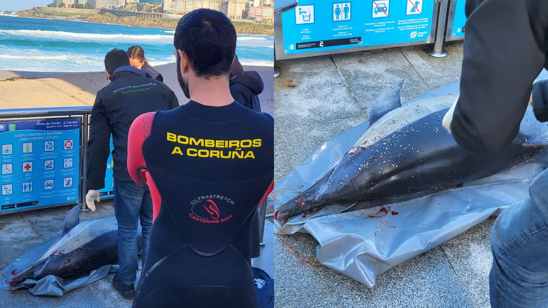 • Los Bomberos de A Coruña participaron en el rescate del delfín que habría fallecido enredado en mallas de pesca