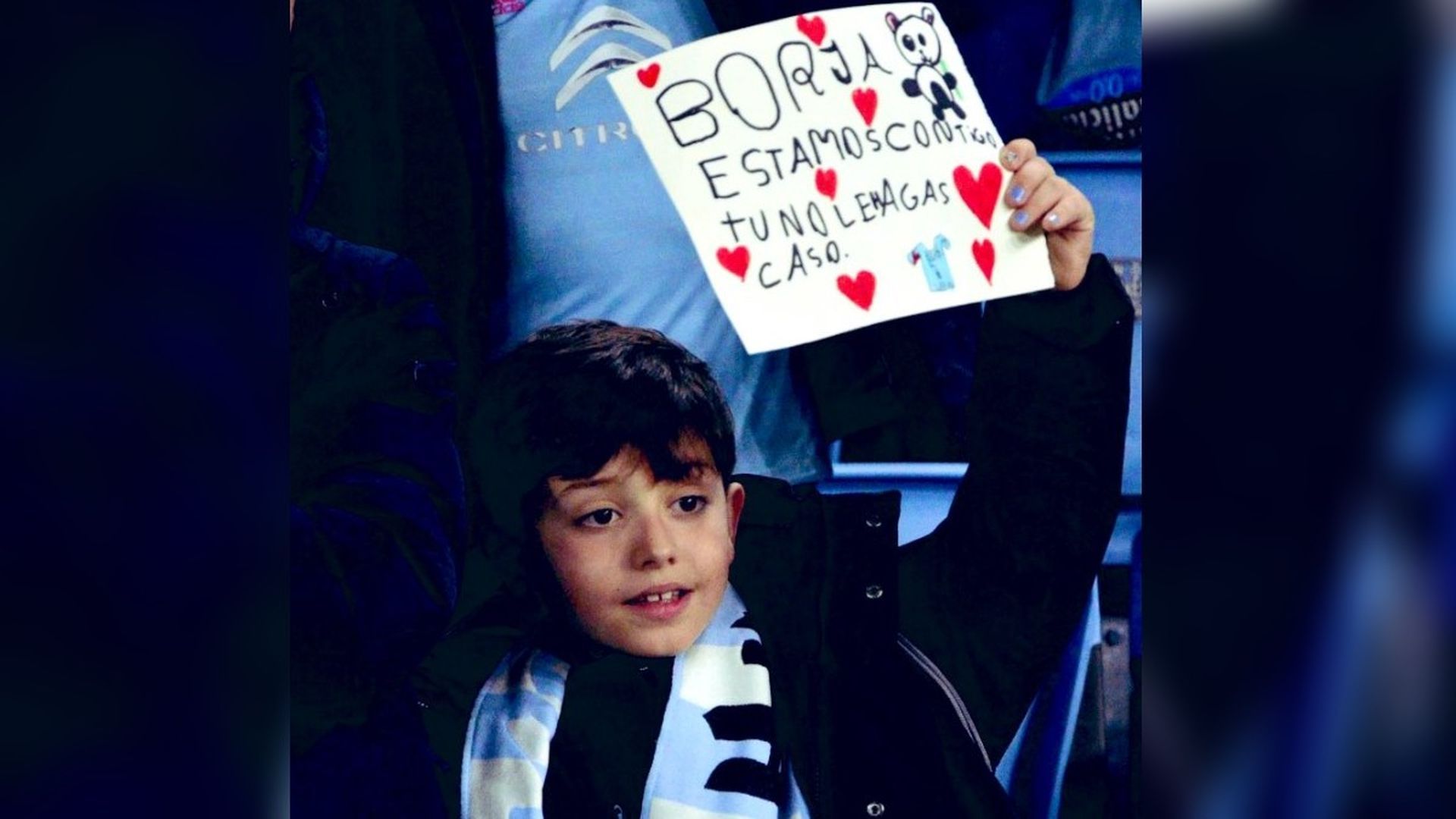 Pero en medio de la marea celeste y de las uñas pintadas, estaba André sujetando sin soltarla, una pequeña pancarta, durante todo el partido. “Había preparado una en casa de su abuela antes de ir al partido, cuenta Adrián, su padre, “pero no le gustó, y por el camino a Vigo, en el coche hizo esta”. Una pancarta sencilla, apenas una cartulina, que mantuvo casi todo el partido bien en lo alto, para que se viera bien: “Borja, estamos contigo. Tú no le hagas caso”, le decía André con su inocencia llena de razones a Borja Iglesias. Alrededor de frase, escrita apresuradamente camino a Balaídos, dibujó corazones, un panda, una camiseta celeste. Un sencillo mensaje dibujado por un niño que estaba lleno de empatía y respeto.