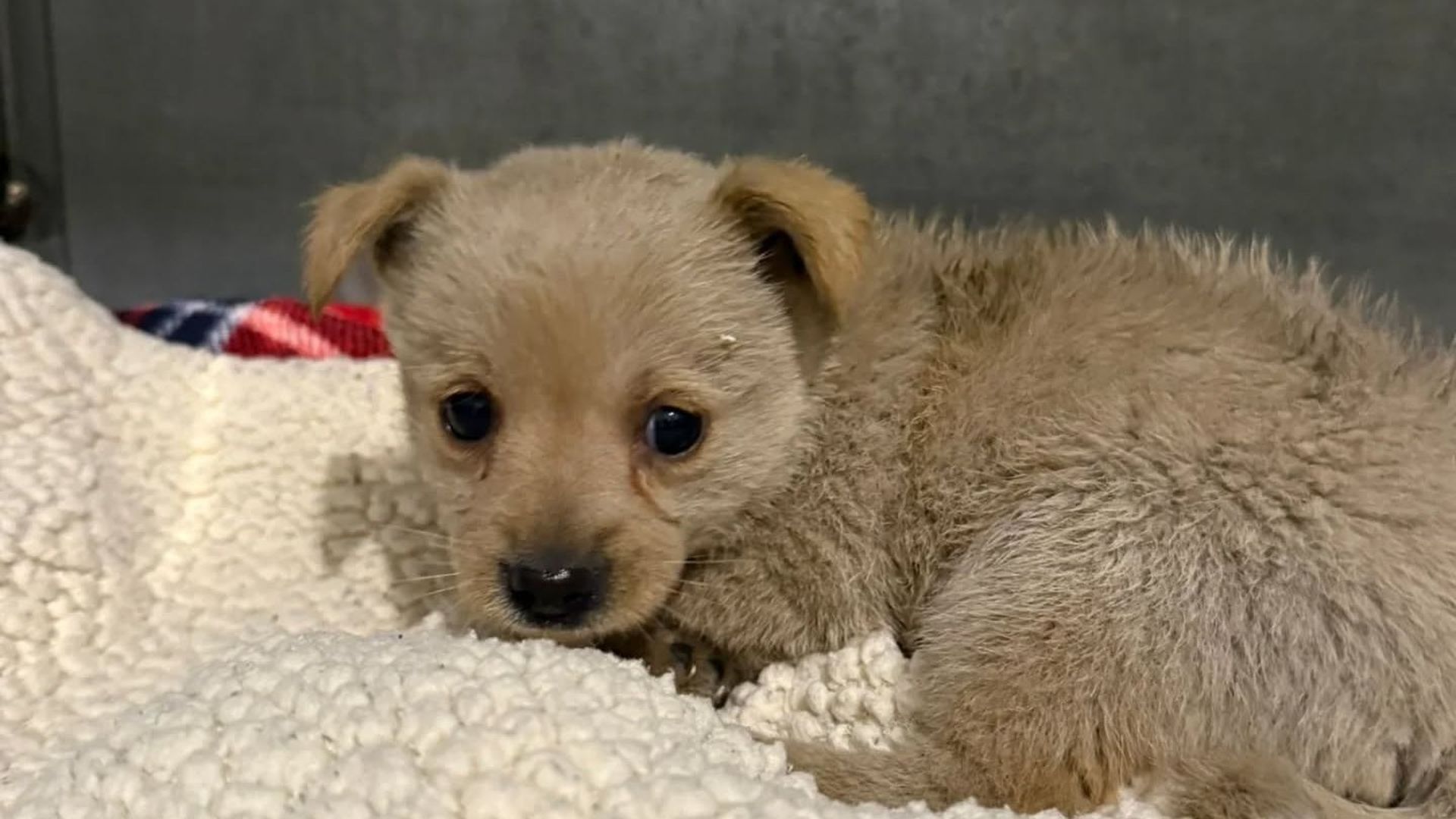 Uno de los cachorros que apareció abandonado en una caja.. Os Palleiros