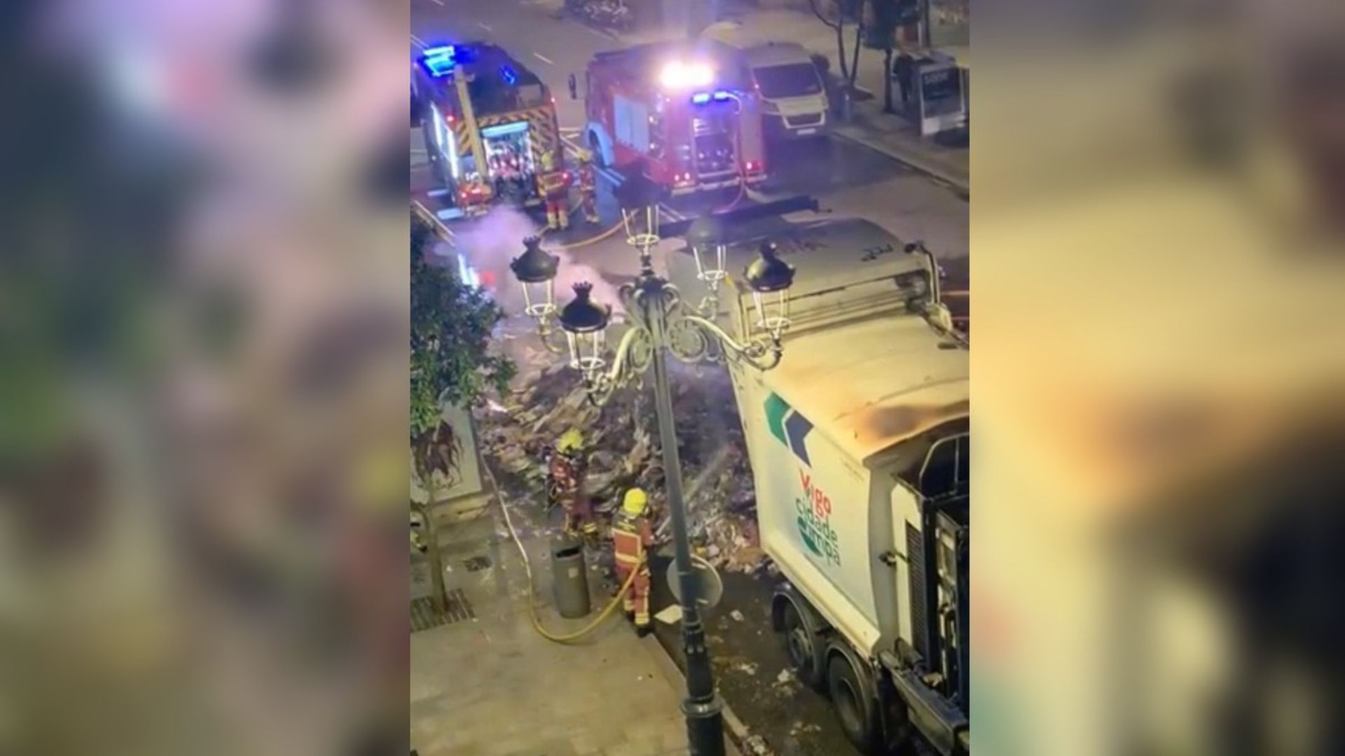 En la madrugada de este miércoles algunos vecinos y vecinas de Vigo pudieron presenciar un suceso bastante llamativo aunque, por fortuna, poco habitual, al haberse incendiado un camión de recogida de basura en plena calle García Barbón, provocando una escena inusual y un tanto desagradable al dejar su contenido esparcido por la vía pública.