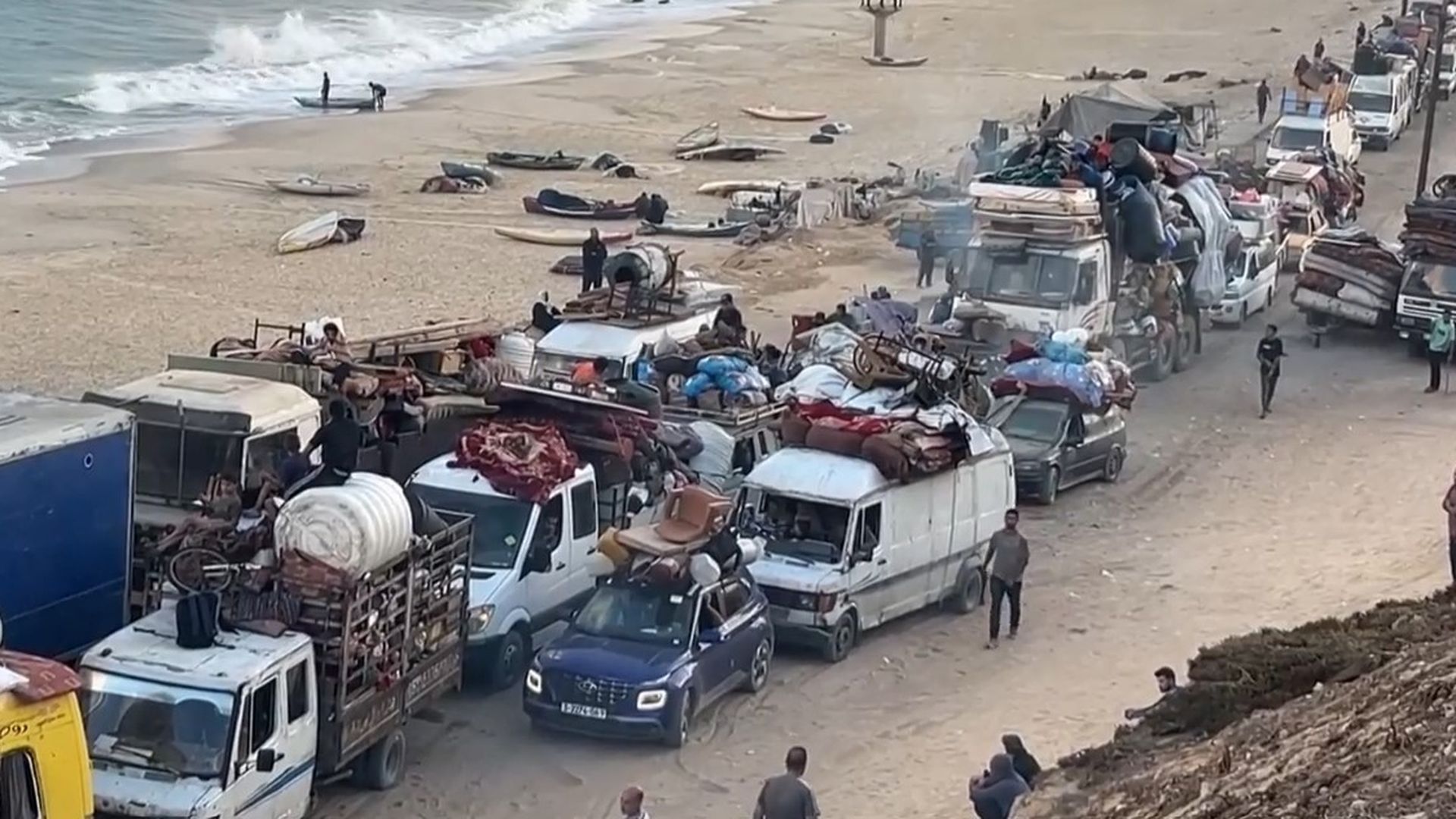 La gente huye, atascados en una columna que parece no tener fin marchan a duras penas los palestinos, que han sobrevivido a los bombardeos israelíes de los dos últimos años en un éxodo forzoso. Se ven camiones destartalados, oxidados que a trompicones avanzan, desbordados de enseres y familias.