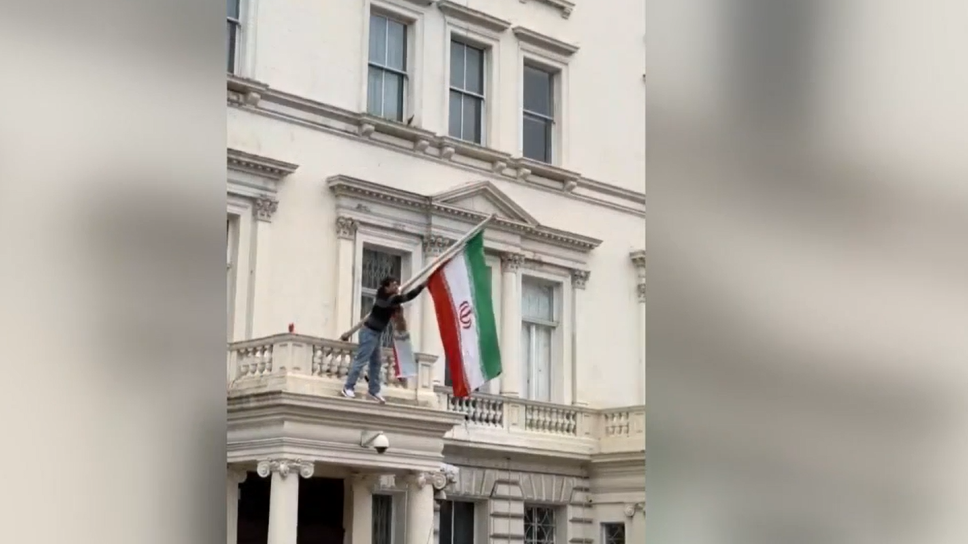 Un vídeo difundido en las redes sociales mostró a un varón en el balcón de la misión diplomática, ubicada cerca del Hyde Park londinense, donde aparentemente arrancó la bandera de la Revolución Islámica y la sustituyó por otra con el símbolo del león y el sol, que se utilizaba hasta el derrocamiento de la dinastía real de los Pahlaví en 1979.