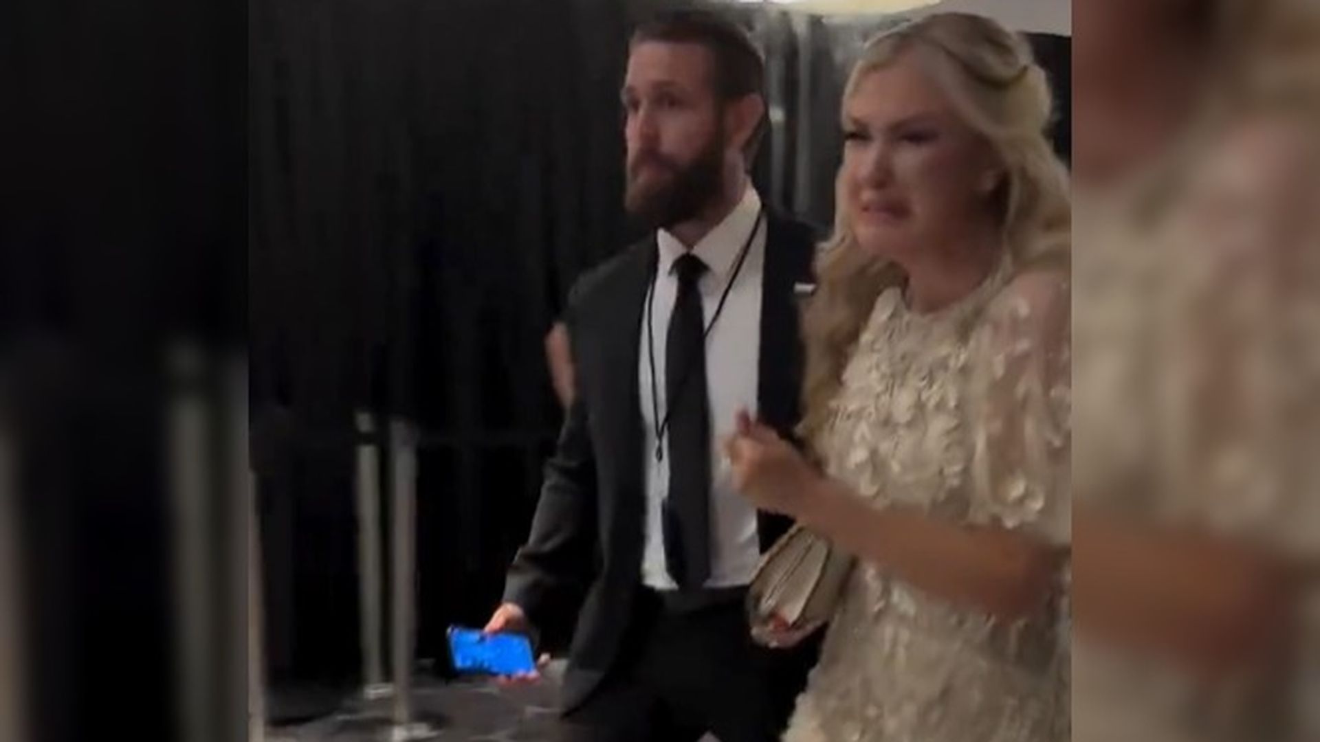 En imágenes que circulan por la Red se puede ver a Erika Kirk siendo desalojada junto al resto de invitados, con una visible actitud nerviosa y entre lágrimas.