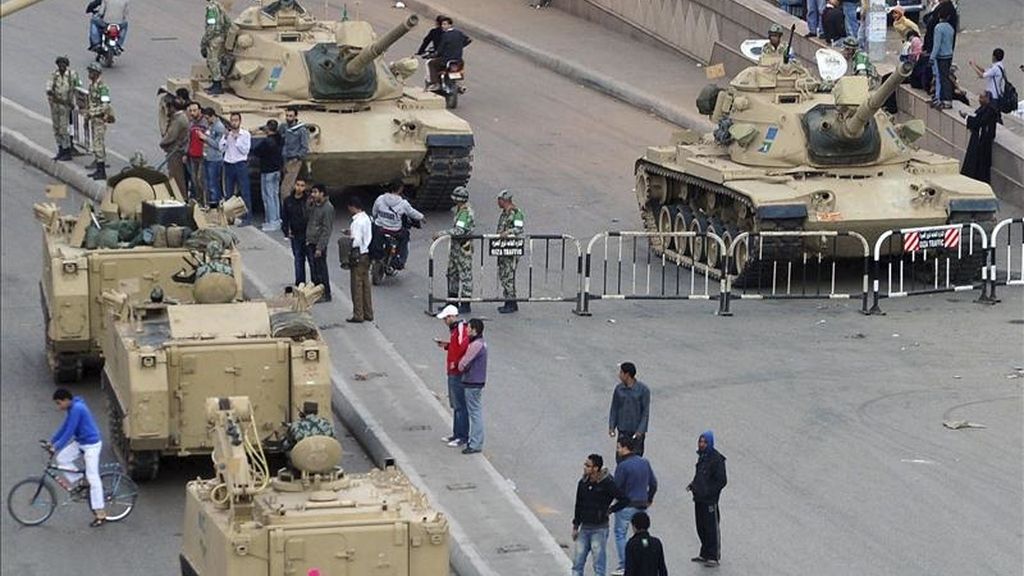 Tanques blindados de las Fuerzas Armadas egipcias toman sus respectivas posiciones de el-Haram, en El Cairo, Egipto. EFE