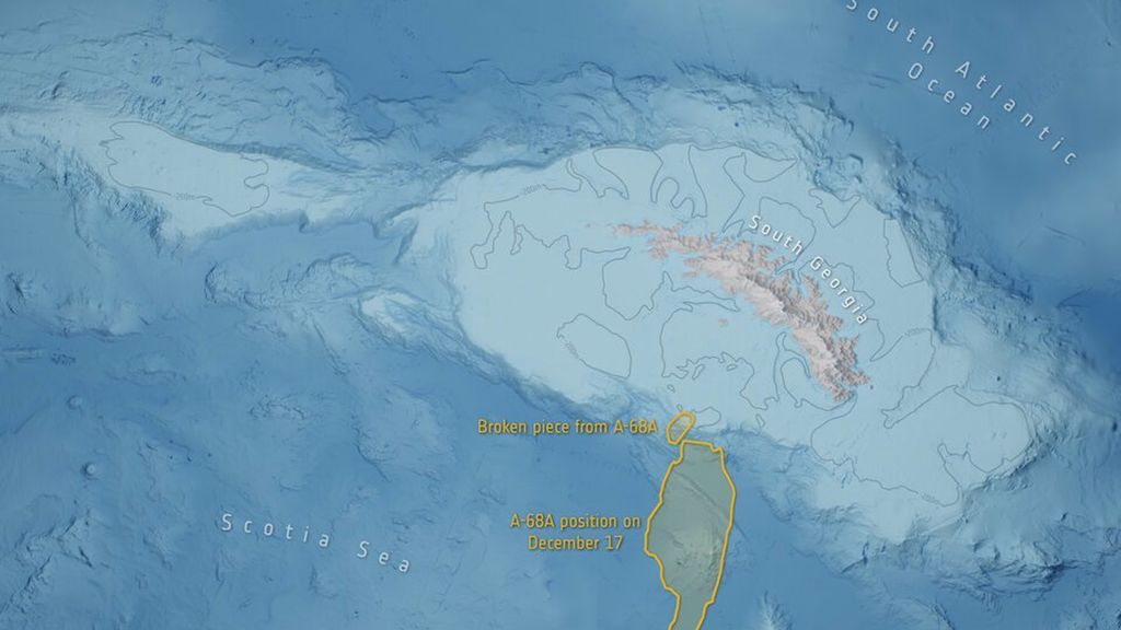 Nuevas imágenes de satélite revelan que el megaiceberg A-68A ha girado en el sentido de las agujas del reloj, moviendo un extremo más cerca de Georgia del Sur y hacia aguas poco profundas. Al hacerlo, el enorme témpano flotante, del tamaño de Ibiza, podría haber raspado el fondo marino, que en la zona tiene menos de 200 metros de profundidad, provocando que un enorme bloque de hielo se desprendiera de la punta norte del iceberg.