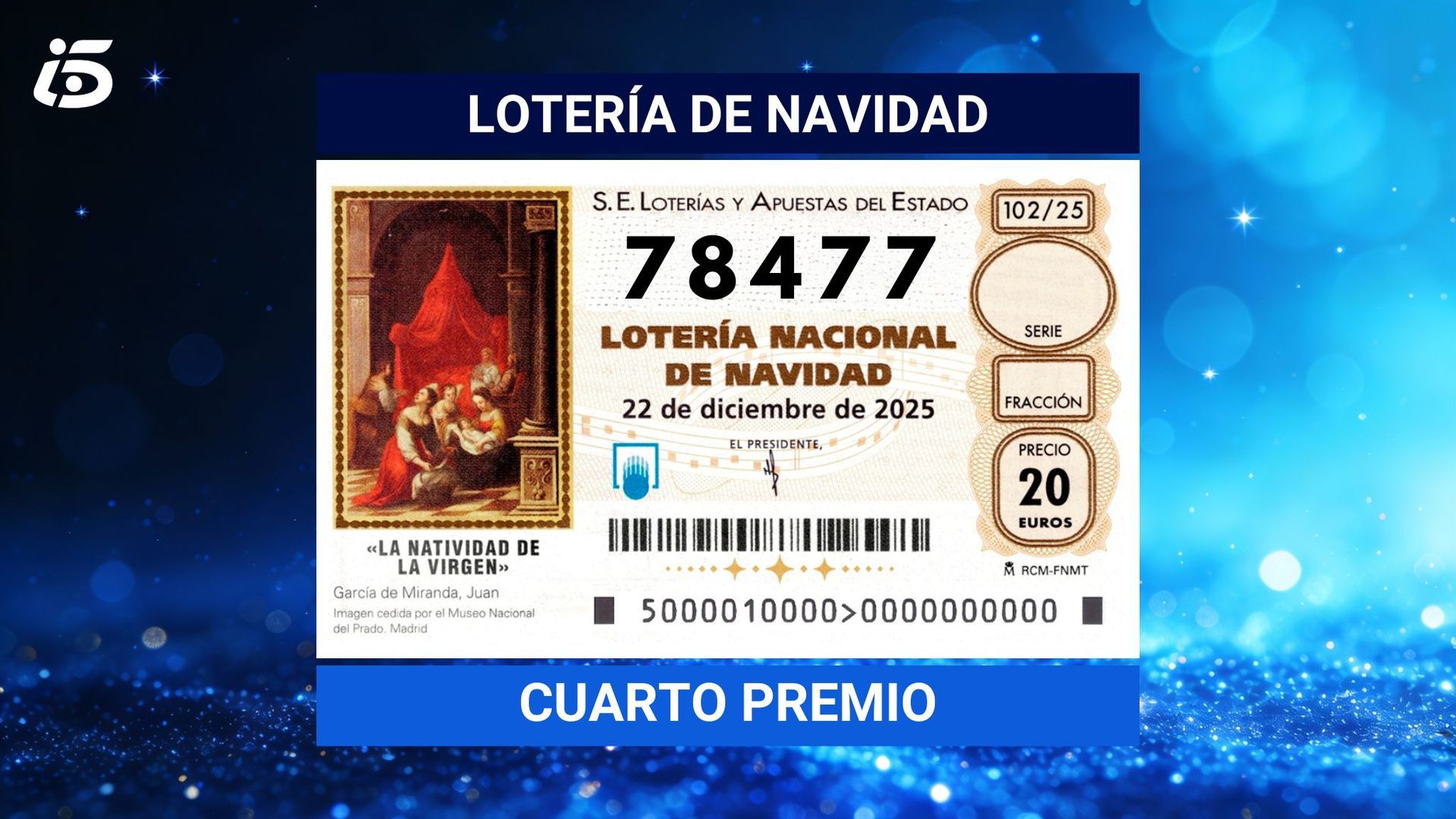 El número 78477 ha resultado agraciado con el primero de los dos cuartos premios del Sorteo Extraordinario de Lotería de Navidad, dotado con 200.000 euros a la serie.