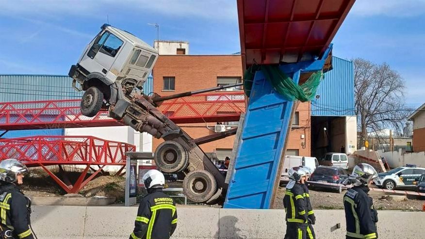 Aparatoso accidente en Mejorada del Campo: las imágenes de la colisión de un camión contra la estructura metálica de un puente