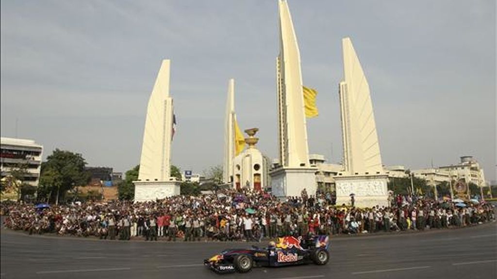 El piloto australiano de la escudería Red Bull de Fórmula Uno, Mark Webber, pasa hoy junto al monumento a la democracia, durante la exhibición en la avenida Ratchadamnoen Klang de Bangkok, Tailandia. EFE
