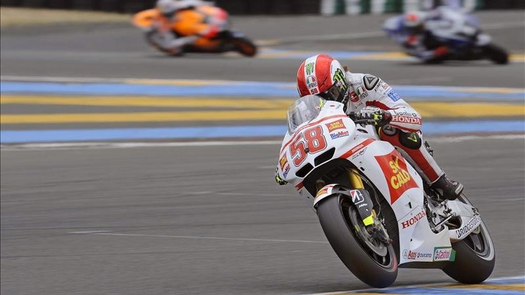 El piloto italiano de MotoGP Marco Simoncelli, de San Carlo Honda Gresini, conduce su motocicleta en el Gran Premio de Francia de motociclismo celebrado en Le Mans, Francia. EFE