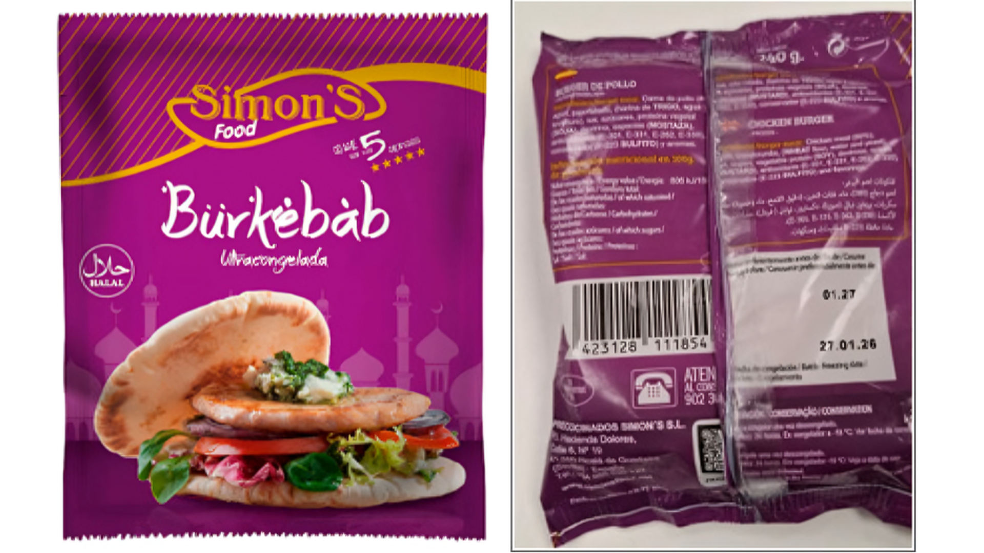 El producto afectado por la presencia de la salmonela es la 'Burkebab' ultracongelada de la marca 'Simon’s Food'. La bolsa contiene tres unidades y la fecha de consumo preferente data de enero de 2027.