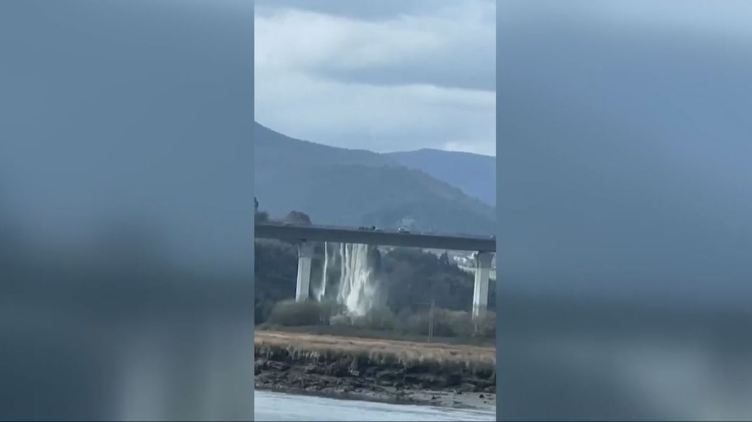 El conductor de un camión cisterna ha resultado herido de gravedad por el vuelco del convoy que conducía en la A-8 a la altura de Navia, en Asturias. Tras el accidente, se ha podido ver una espectacular cascada de leche cayendo desde lo alto del puente donde se ha producido el siniestro.