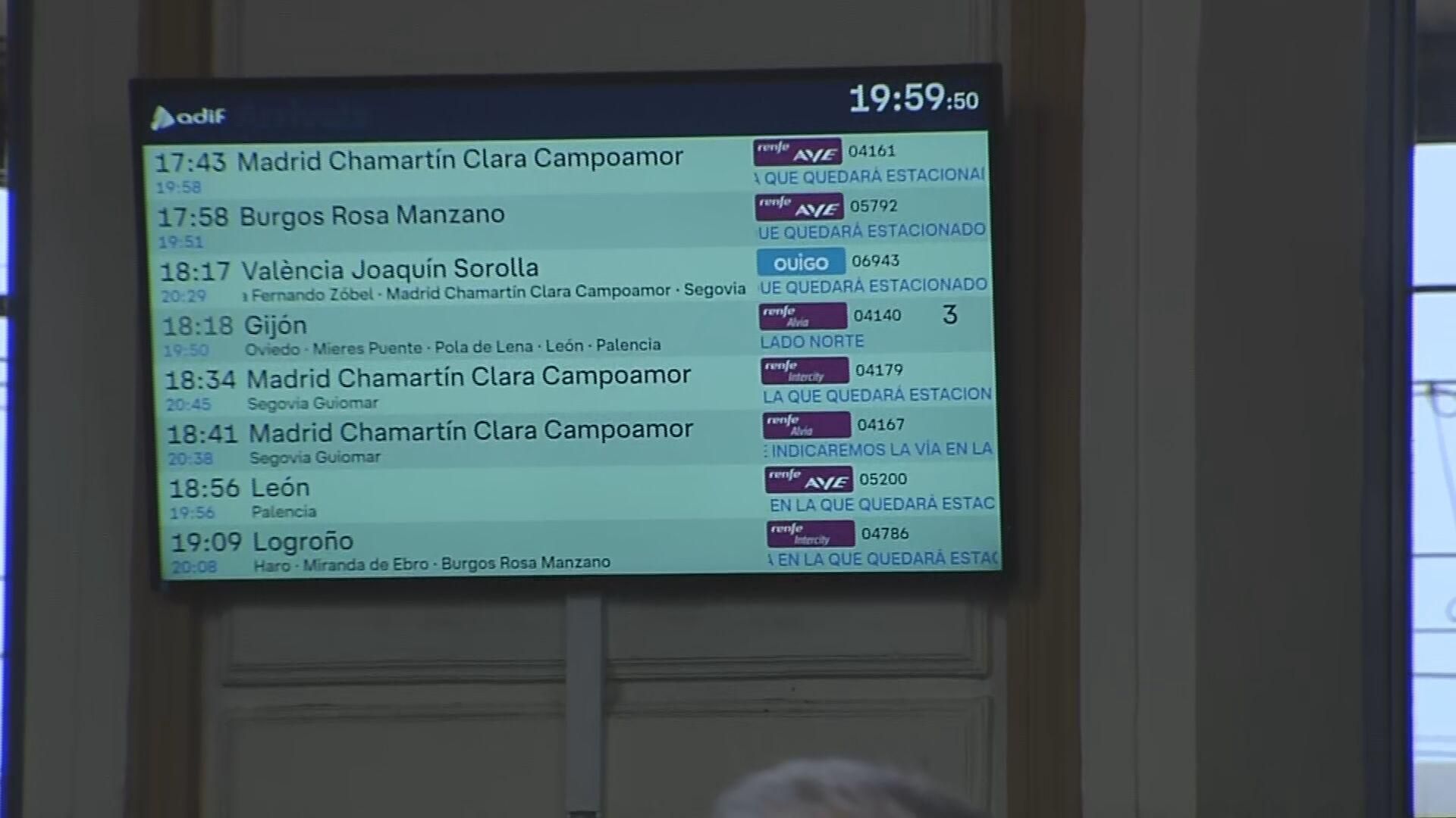 Los Alvia son Gijón 15:12 - Alicante 22:56, detenido en Palencia; Alvia Madrid 17:37 - Irún 23:15, con salida demorada, y el Alicante 15:26 - Gijón 23:01, detenido en Madrid Chamartín.