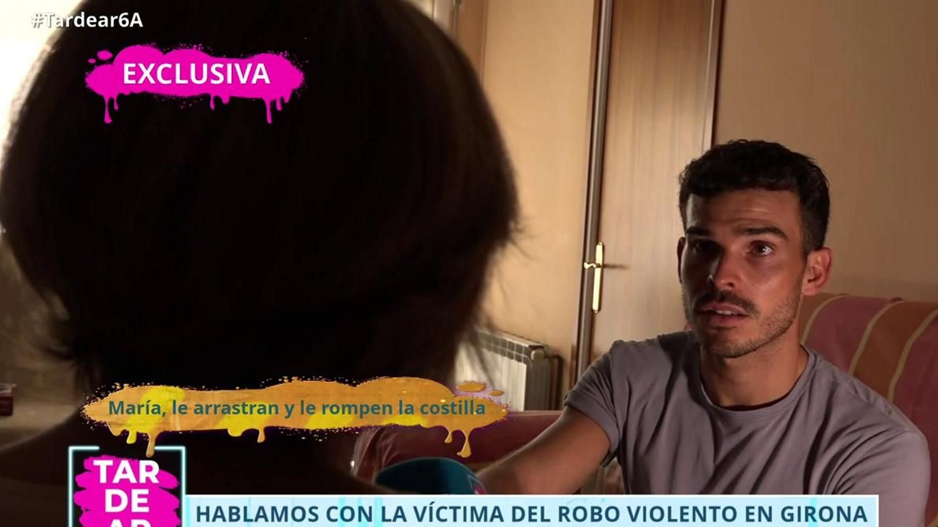 María fue víctima de un robo con violencia a manos de un reincidente en Girona. La mujer volvía en dirección a su casa sin darse cuenta de que un hombre la perseguía. "Iba a cuidar de mi nieto", le explica a Juan Rodríguez, periodista de 'Tardear'. De repente, escuchó un "estruendo muy grande" en su portal cuando ya había entrado.