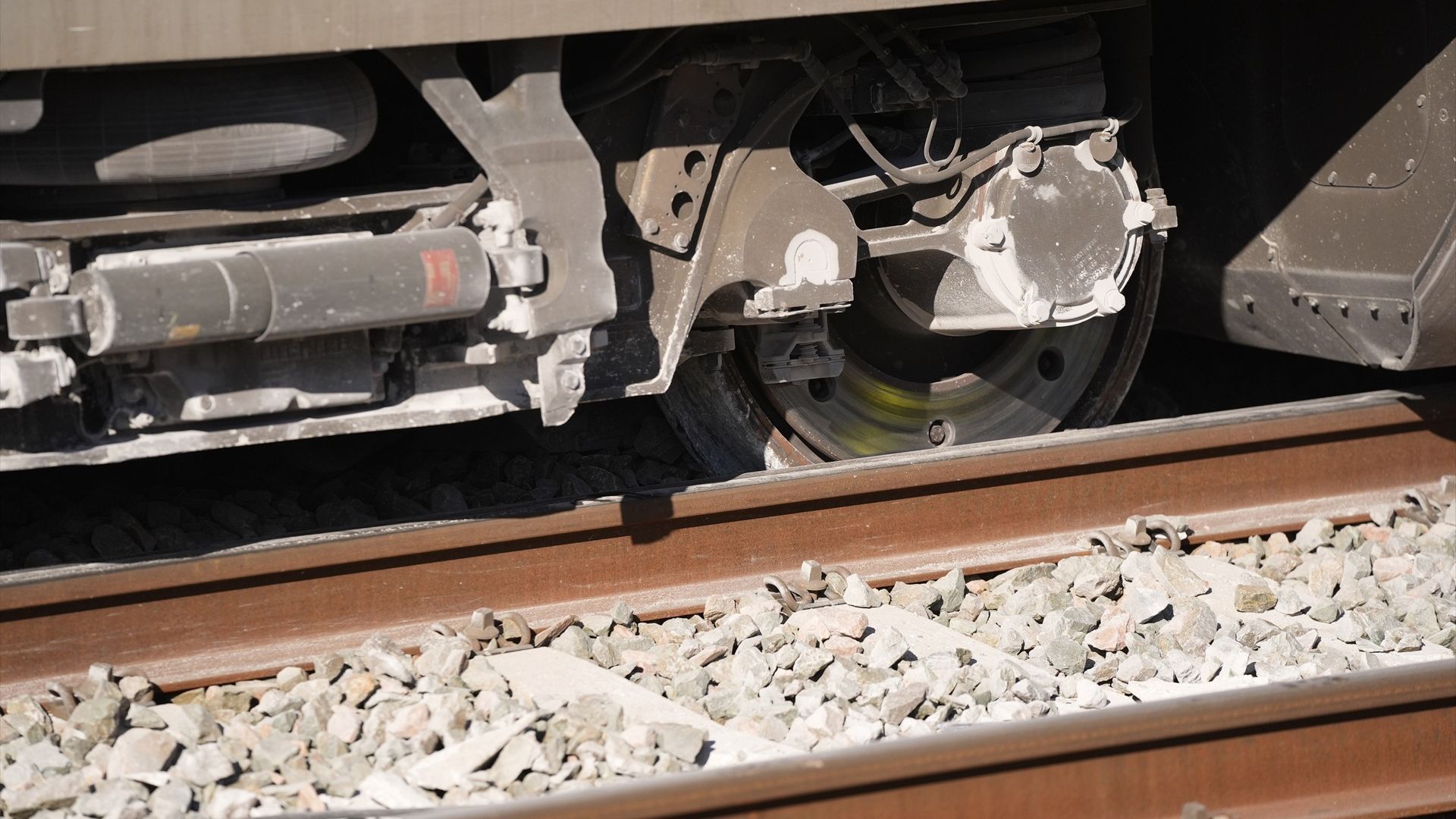 Vista de las ruedas de uno de los vagones del tren de Iryo fuera de los carriles de la vía
