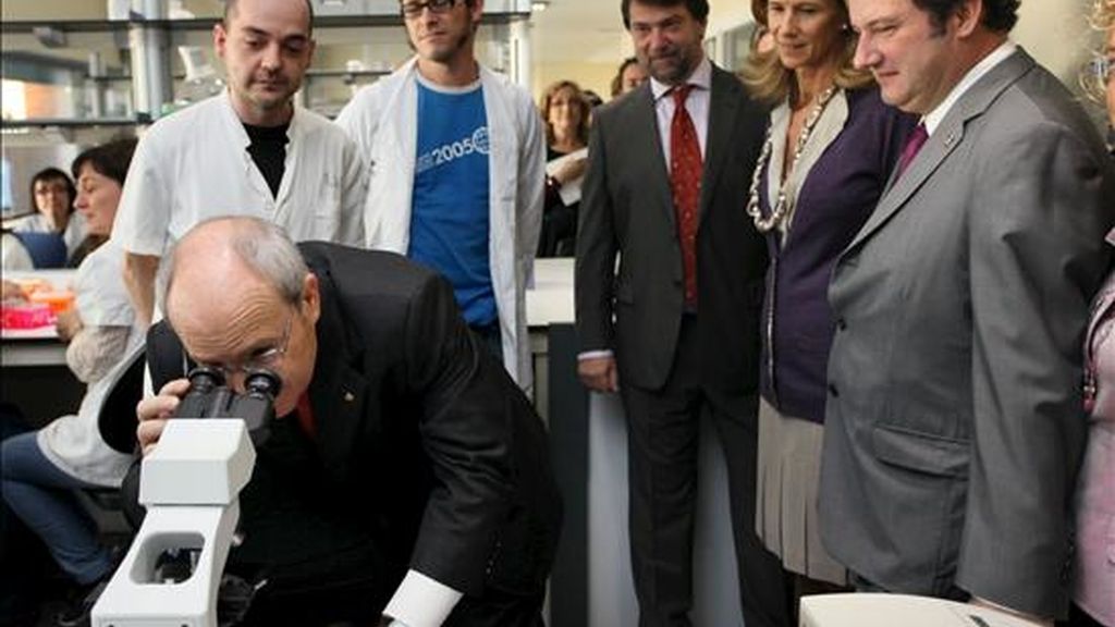 El presidente de la Generalitat, Jose Montilla(i), acompañado de la ministra de Ciencia e Inovación, Cristina Garmendia y el alcalde de Barcelona Jordi Hereu (d), mira por un microscospio durante la inauguración del Centro Esther Koplowitz (CEK ) para la investigación médica que ha supuesto una inversión de 60 millones de euros. EFE