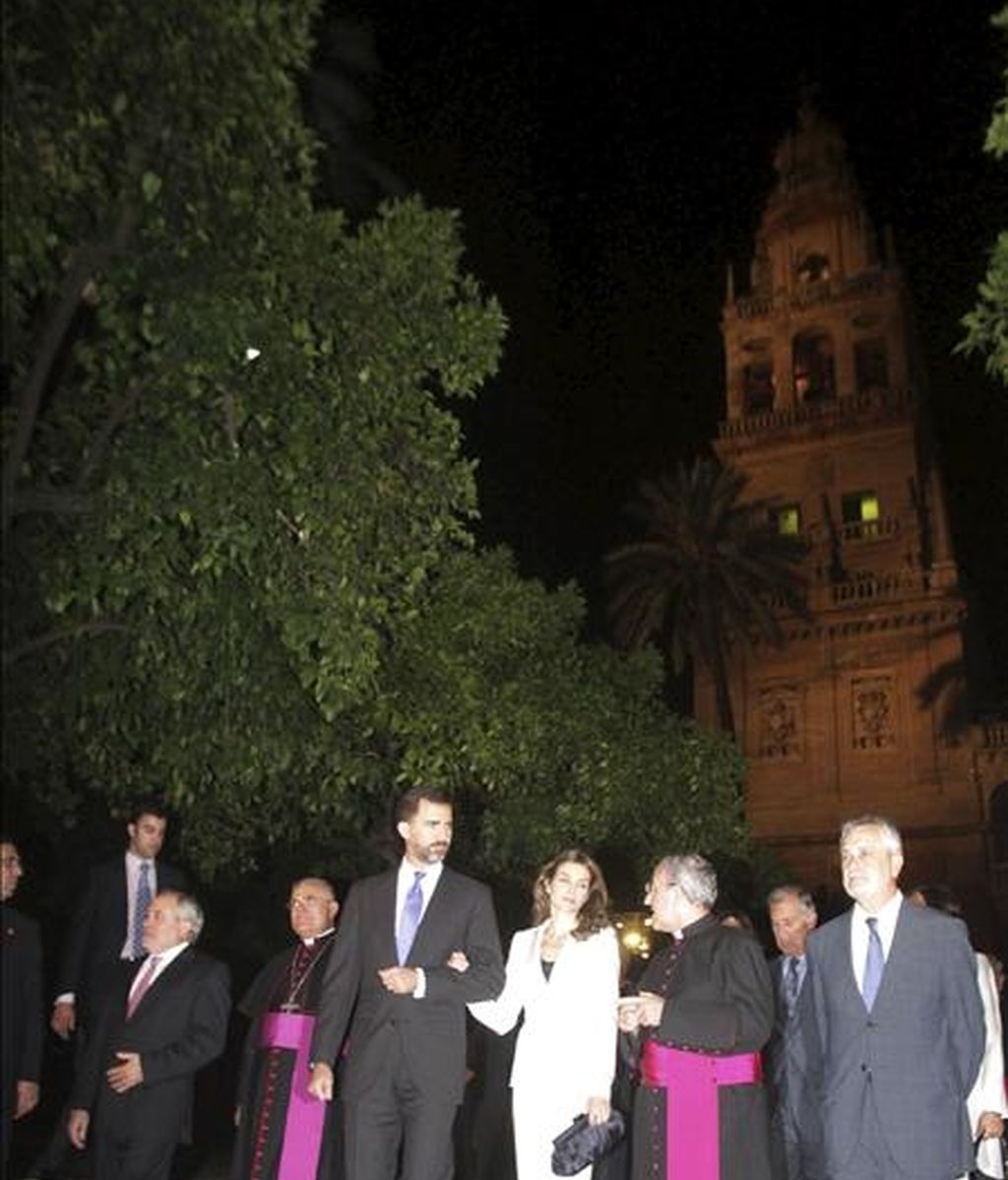 El príncipe Felipe (3i) y la princesa Letizia, acompañados por el alcalde de Córdoba, Andrés Ocaña (i), el obispo de Córdoba, Demetrio Fernández González (2i), el presidente del Cabildo de la Catedral, Manuel Pérez Moya (2d), y el presidente de la Junta de Andalucía, José Antonio Griñán, durante la inauguración de la visitas nocturnas a la Mezquita-Catedral de Córdoba, organizadas bajo el título "El Alma de Córdoba", esta noche en la ciudad califal. EFE