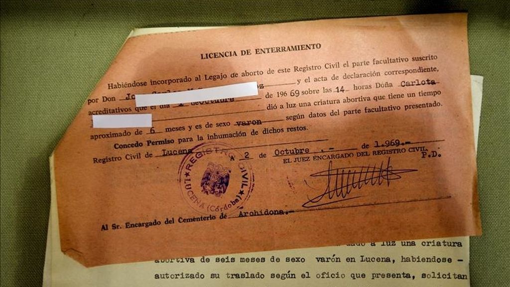 En la muestra hay un libro de registro de inscripción de abortos, con datos recabados entre 1956 y 1976, un certificado de aborto del hospital de San Juan de Dios de Málaga de 1965, una hoja impresa sin rellenar del boletín estadístico de abortos del mismo año o la autorización del juez de Lucena para la inhumación de un feto, junto al expediente judicial correspondiente, también de 1965.