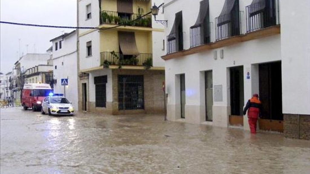 Imagen de una calle de la localidad sevillana de Écija, donde los más de 60 litros por metro cuadrado caídos desde primera hora de la mañana han provocado el desbordamiento del arroyo Argamasilla, un afluente del río Genil, apenas doce días después de la inundación que anegó parte de la ciudad. EFE