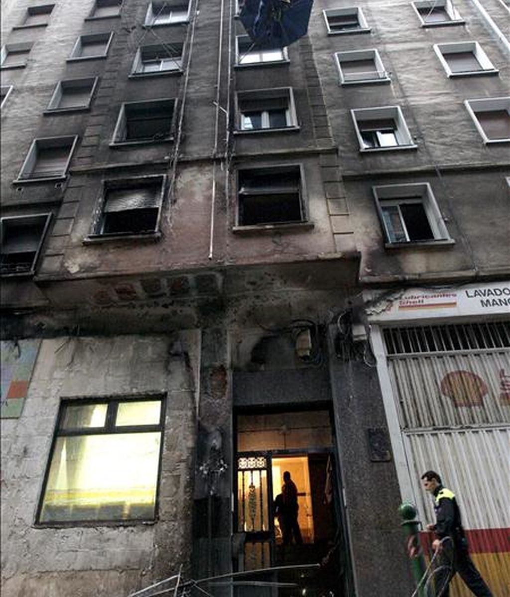 Fachada del inmueble del barrio bilbaíno de Rekalde cuyos vecinos tuvieron que ser desalojados esta madrugada a causa de un incendio originado, al parecer, en unos contenedores. EFE